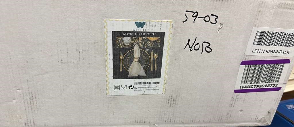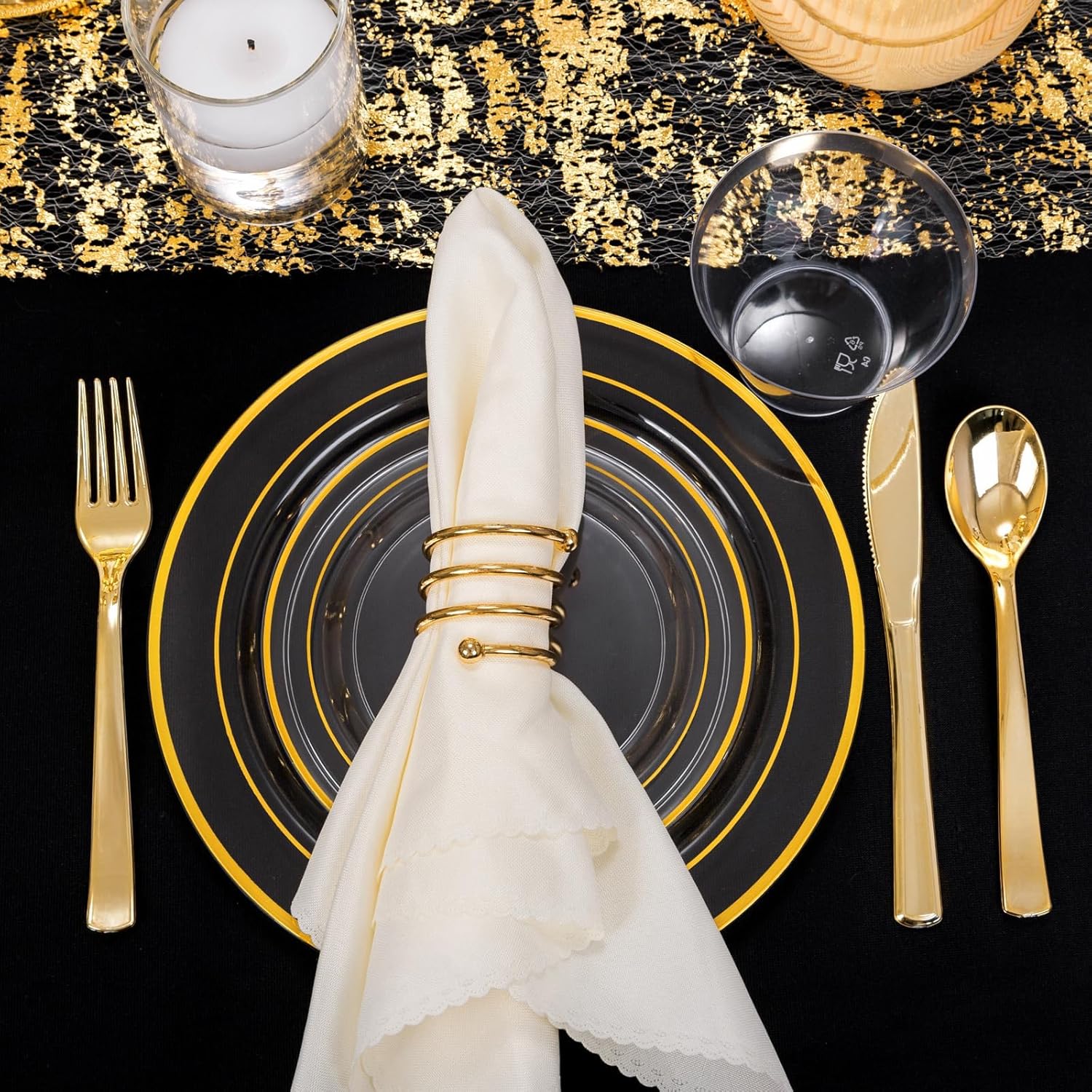 WELLIFE 600pc Gold Trim Plastic Dinnerware Set for Party: 100 Dinner Plates, 100 Dessert Plates, 300 Cutlery, 100 cups